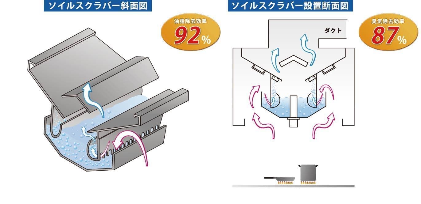 厨房や店内の空気がどんよりとしている、煙い、臭いが抜けない等々。これらの悩みは全て、排気ファンやダクトに付着した油やホコリが原因です。そのまま放置すると、油塵は厚くこびりつき、排気能力はどんどん低下します。結果的には、設備や壁までベトついて不快な臭いを発し、お店のイメージダウンにつながります。そこで、ソイルスクラバーの登場です。ダクトに排気が入る前の部分で、水だけを使って排気油やホコリ、臭いまでを取り除いてしまうソイルスクラバーなら、こんな悩みは即解決。
